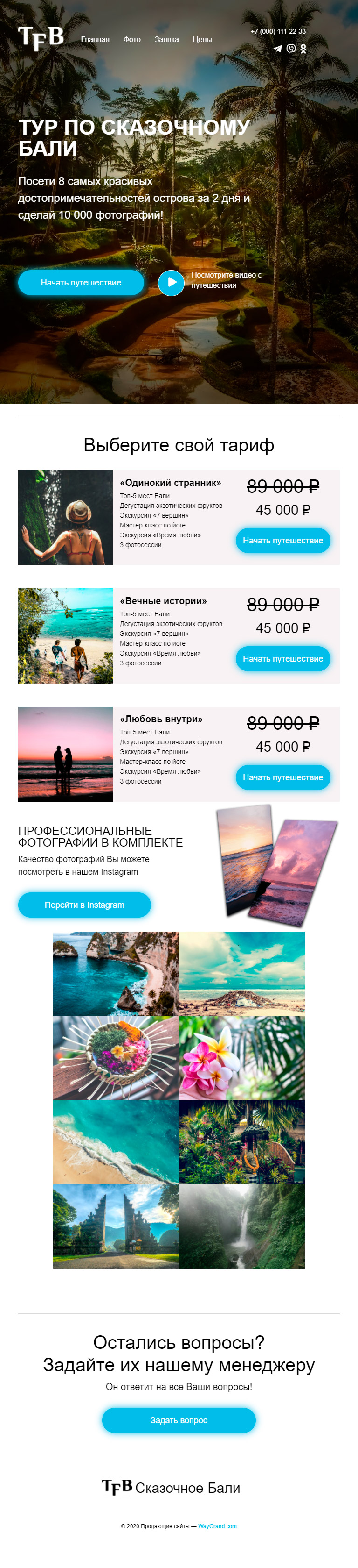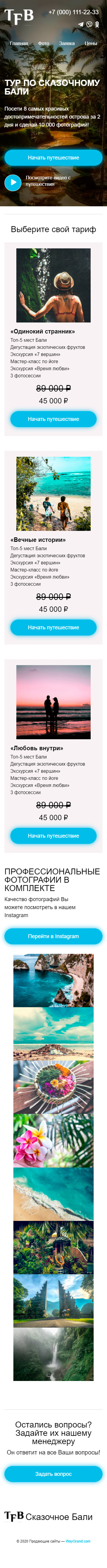- Промоблок "Тур по сказочному Бали" с кнопкой призыва к действию "Начать путешествие"