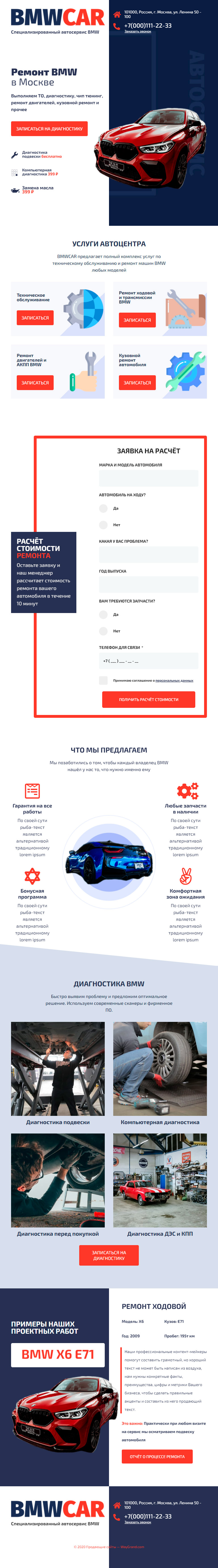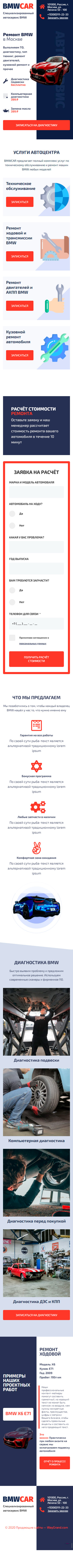 Закажите готовый продающий сайт лендинг #0210202 в Подольске за 1-3 дня «под ключ» по выгодным ценам на WayGrand: свёрстан, отрисован и готов к рекламе. Тематика шаблона «Ремонт BMW».