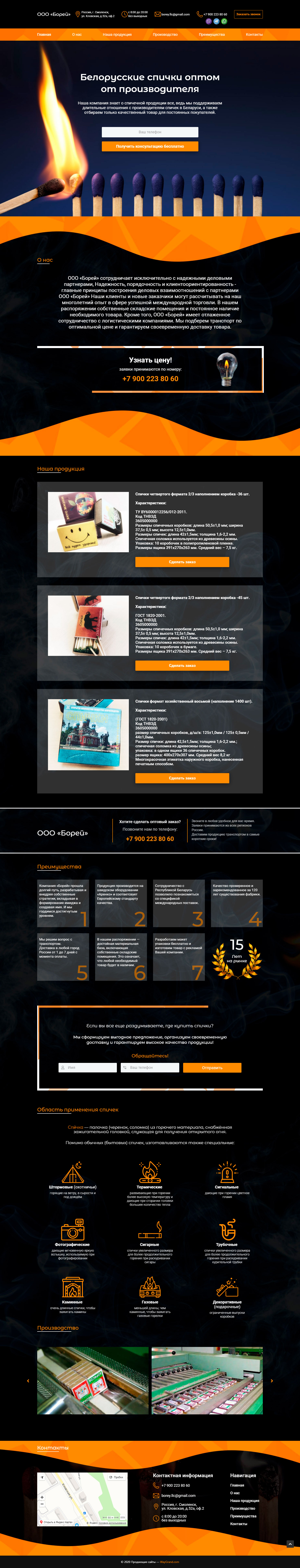 Закажите готовый продающий сайт лендинг #115 в Подольске за 1-3 дня «под ключ»: свёрстан, отрисован и готов к рекламе. Тематика шаблона «Белорусские спички оптом от производителя».